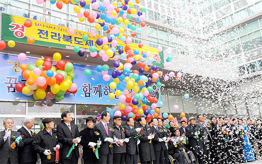 전라북도 체육회관 준공식이 23일 열린 가운데 참석자들이 테이프 컷팅을 하고 있다. 전라북도 체육회관은 전주 종합경기장 내 총사업비 156억 원을 들여 지하 1층 지상 5층 규모로 신축됐다.