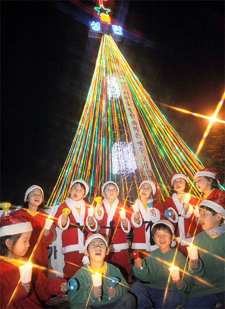 크리스마스를 하루 앞둔 24일 전주 코끼리 유치원 어린이들이 전주종합경기장 네거리 대형 크리스마스 트리 앞에서 예수그리스도의 탄생을 축복하며 노래를 하고 있다.