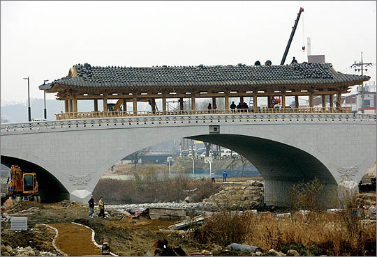 전주 한옥마을의 관문인 남천교가 28일부터 개통된다. 길이 82.5m, 폭 25m 규모의 남천교는 한옥누각을 올린 형태로 지어졌다.