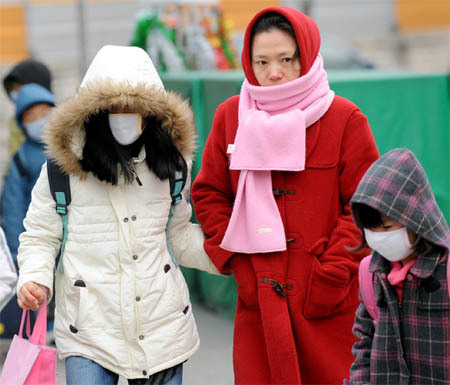 매서운 겨울 한파가 몰아친 28일 군산의 한 초등학교에서 학생과 학부모가 마스크와 목도리를 두른채 등굣길을 서두르고 있다.