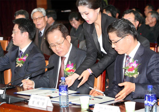 29일 전북도청에서 열린 일진경금속의 임실농공단지 내 투자협약식에 참석한 일진그룹 허진규회장(가운데)과 일진경금속 정희원 대표(오른쪽)가 협약서에 서명을 하고 있다.