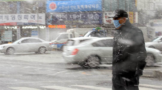 찬바람과 함께 눈발이 거셌던 30일 오전 전주경기장 네거리에서 한 시민이 횡단보도를 건너고 있다.