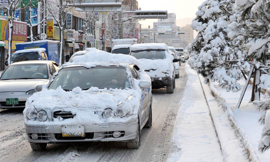 밤새 함박눈이 소복히 내린 지난달 31일 오전 전주시내 도로에서 차량들이 거북이 운행을 하고 있다.