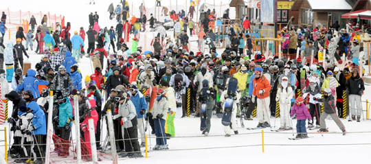 2010 경인년 첫날인 1일 무주리조트 스키장을 찾은 스키어들이 은빛 설원을 누비기 위해 슬로프에 길게 줄지어 서있다.