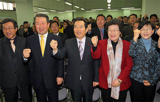 민주당 정세균 대표와 박주선, 장상 최고위원 등 당직자들이 4일 오전 서울 영등포 당사에서 열린 시무식에서 지방선거 승리를 다짐하는 구호를 외치고 있다.