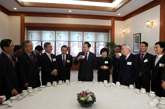 이명박 대통령이 5일 낮 청와대에서 김기환 부의장을 비롯한 국민경제자문회의 위원들과 오찬 간담회를 하고 있다.
