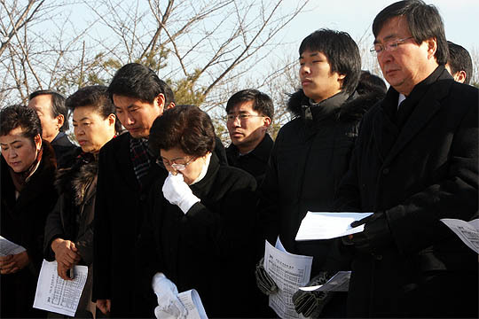 김대중 전 대통령의 서거 후 첫 생신인 6일 국립서울현충원 김 전 대통령 묘소에서 열린 추모예배에서 부인 이희호 여사, 차남 김홍업 전 의원 등 참석자들이 기도하고 있다.