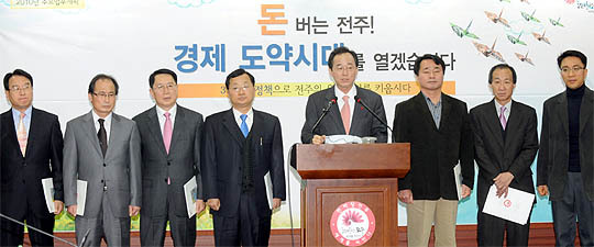6일 송하진 전주시장과 간부 공무원들이 시청 회의실에서 2010년은 돈버는 전주 경제 도약의 시대로 열겠다는 기자회견을 하고 있다.