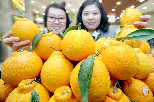 8일 롯데백화점전주점에서 직원들이 제철을 맞아 본격적으로 출하되고 있는 제주산 한라봉을 들어 보이고 있다. 한라봉은 비타민C의 함유량이 높아 동맥경화와 고혈압예방 및 신진대사촉진 등의 효과가 있는 것으로 알려져 있다.