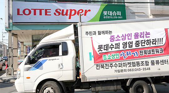 지난 8일 전주시 송천동에 롯데슈퍼가 '기습개점'하면서 기존 마트에 납품을 하던 지역 유통업체들이 이에 항의하며 차량 선전전을 펼치고 있다.