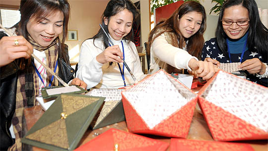 12일 전주시 외국인 서포터즈들이 한옥마을 투어를 마치고 교동아트센터에서 한지함 만들기 체험을 하고 있다. 영어권과 중국어권 동남아권 일본어권 등으로 구성된 서포터즈는 외국인과 관광객들이 겪은 생활의 불편 불만사항을 해소하고 전주를 홍보하는 역할을 한다.