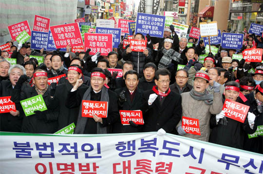 '행정도시 혁신도시 무산저지 충북비상대책위원회'와 민주당, 자유선진당 등 야당은 13일 오후 민주당 이강래 원내대표 등 관계자 150여명이 참석한 가운데 청주시 성안길에서 집회를 열고 원안사수 투쟁에 나선다고 밝혔다.