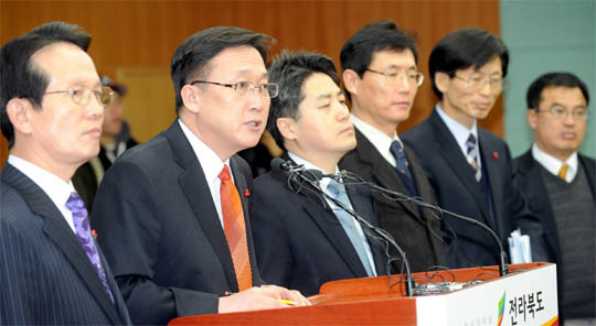 13일 도청 브리핑룸에서 이경옥 행정부지사와 실국장들이 세종시 발전방안의 주요 현안별 영향분석 및 대응방안에 대한 기자회견을 하고 있다.