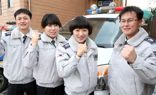 현장실습을 나온 중앙경찰학교의 신임경찰관들이 전주 완산경찰서에서 화이팅을 하며 각오를 다지고 있다. 사진 왼쪽부터 정한진·장윤미·국수한·김종필 순경.