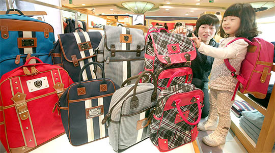 14일 롯데백화점전주점에서 초등학교 입학을 준비하기 위해 엄마와 아이가 책가방과 손가방을 고르고 있다.