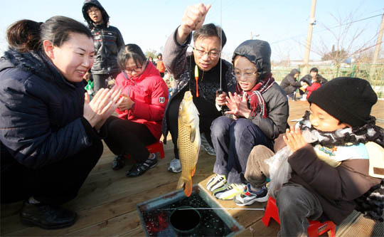 연일 계속된 한파가 주춤했던 17일 완주 이서면 물고기마을 가족낚시터를 찾은 시민들이 물고기 낚시를 만끽하고 있다.