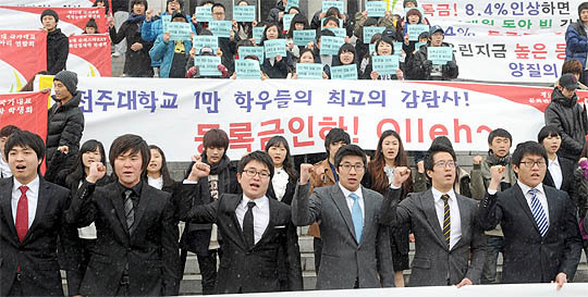 지난 15일 전주대학교 본부앞에서 등록금 인상을 반대하는 제27대 전주대학교 총학생회 학생들이 등록금 인하를 촉구하는 구호를 하고 있다.