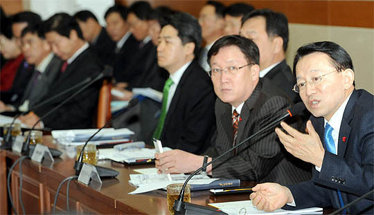 15일 전북도청 회의실에서 열린 확대간부회의에서 김완주지사가 간부공무원들에게 질문을 하고 있다.
