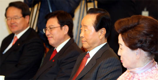 김영삼 전 대통령이 18일 서울 신라호텔에서 가진 82회 생일 축하 만찬에서 정몽준 한나라당 대표와 안상수 원내대표를 비롯한 참석자들과 환담하고 있다.