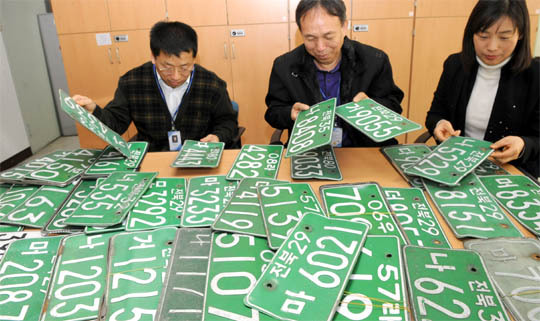전주 완산구청 징수반 직원들이 영치된 번호판을 분류하고 있다.