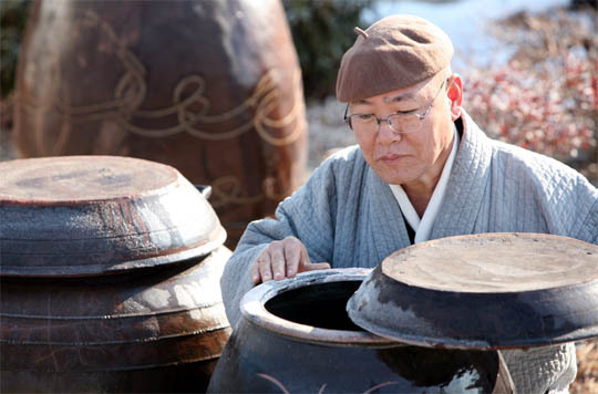 완주군 구이면 송화양조사의 벽암 조영귀(61) 대표가 송화백일주를 담아놓은 항아리를 열어 술의 상태를 확인하고 있다.