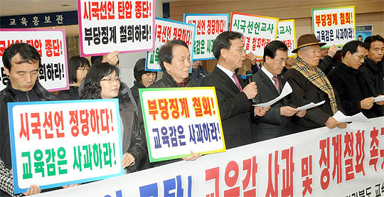 공무원·교사탄압 저지 전북대책위 회원들이 20일 도교육청에서 시국선언 탄압 교육감 사과와 징계 철회를 촉구하는 시위를 벌이고 있다.