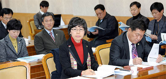 21일 전주시의회 회의실에서 열린 2009 예산정책연구회 개인별 연구주제 발표 및 활동보고회에서 의원들이 연구주제 발표를 경청하고 있다. 전국 기초의회 가운데 최초로 자치단체 예산을 연구하기 위해 구성된 연구회는 투명한 예산제도 정착과 전주시의 예산 경쟁력 강화에 앞장서고 있다.
