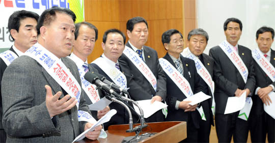 21일 전북도의회 브리핑룸에서 전북지역 10개 시군 의장 및 의원들이 "지역대표성을 무시한 시군의원 정수 책정안"을 반대하는 기자회견을 하고 있다.