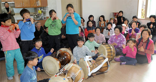21일 오전 김제시 금구면 월전리 당월 녹색농촌체험마을 '산성메마루'에서 지난 4일부터 20박 21일 일정으로 이 마을에 '겨우살이 생태예술캠프'를 온 여수생태미술학교 학생들이 마을 주민들 앞에서 오카리나와 사물놀이를 연주하고 있다.