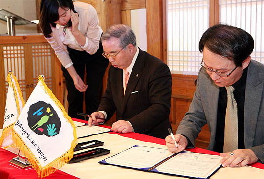 23일 전주국제발효식품엑스포 조직위와 일본 요코테 발효연구소의 협약식에서 문윤걸사무처장(오른쪽)과 타가이토 토시오(왼쪽) 간사장이 협약서에 서명을 하고 있다.
