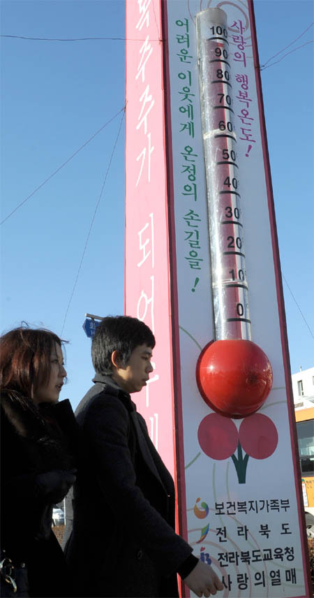 25일 전주 종합경기장 사거리에 설치된 사랑의 온도계가 103.1℃를 가리키고 있다.