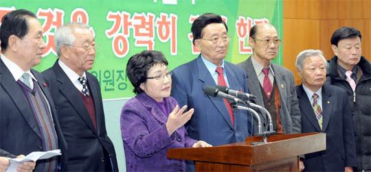 25일 전북도의회 브리핑룸에서 민주당 전북도당 각 시군 노인위원장들이 지방선거때 노인들이 도의회나 시군의회에 비례대표 우선 순위에 들어갈 수 있도록 당 차원의 지원을 해달라는 기자회견을 하고 있다.