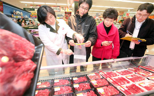 보름 앞으로 다가온 설을 맞아 쇠고기 수요가 늘어날 것에 대비, 전주시청과 전주 덕진구청 및 소비자정보센터 관계자들이 전주의 한 대형마트에서 쇠고기의 이력을 추적하고 샘플을 채취하고 있다.