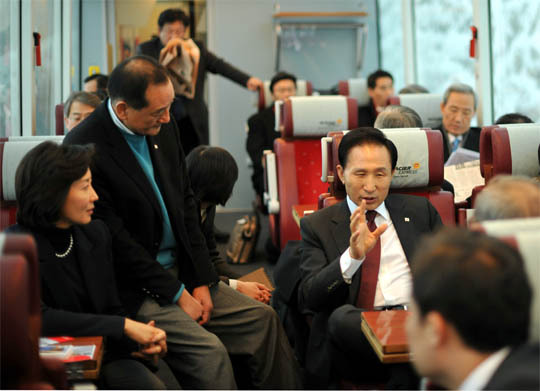 이명박 대통령이 28일(현지시간) 스위스 다보스에서 열리고 있는 '제40회 세계경제포럼(WEF. 일명 다보스포럼)'에 참석하기 위해 취리히에서 출발한 기차에 올라 김효재, 나경원 의원 등 수행원들과 이야기를 나누고 있다. 이 대통령은 이날 단독특별연설을 통해 G20 정상회의의 비전을 내놓을 예정이다.