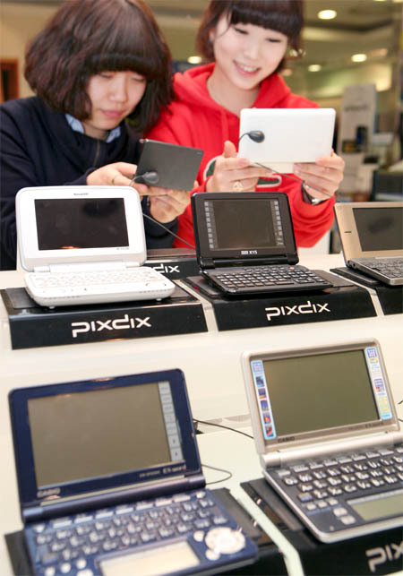 고등학교 졸업식을 1~2주 앞둔 지난달 31일 롯데백화점전주점에서 고객들이 졸업선물 겸 입학선물로 전자사전을 고르고 있다.
