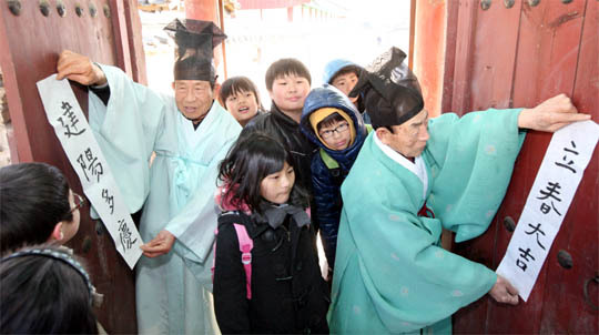 입춘을 하루 앞둔3일 전주향교를 방문한 임실의 한 초등학교 학생들이 입춘의 의미를 배우고 훈장님들이 대문에 입춘 방을 붙이는 것을 보고 있다.