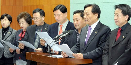 민주당 전북 전주 완산을 시·도의원협의회 의원들이 3일 도의회 브리핑룸에서 전주시의원 정수 및 선거구 획정안 의견제출과 관련, 최찬욱 전주시의장의 사퇴와 선거구획정 조정안에 대해 원천무효를 주장하는 기자회견을 하고 있다.