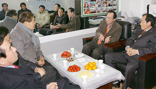 송하진 시장(오른쪽 두번째)이 동부시장을 찾아 관계자들과 환담하고 있다.