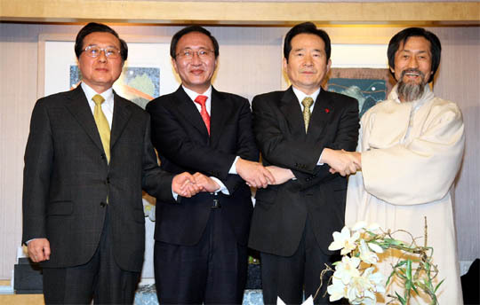 경찰의 민주노동당 서버 압수수색과 관련, 8일 오전 민주노동당 강기갑 대표를 비롯, 민주당 정세균대표와 진보신당 노회찬대표, 창조한국당 송영오대표 등 야 4당이 서울 렉싱턴 호텔에 모여 회의를 열기 앞서 손을 맞잡고 있다.