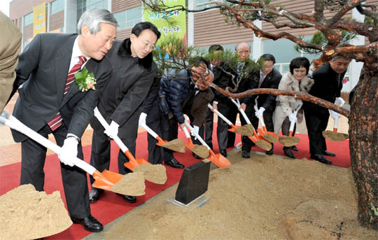 8일 진안군 백운으로 이전하는 전라북도산림환경연구소 신청사 개청식에서 김완주지사와 장재영군수등 참석자들이 기념식수를 하고 있다.