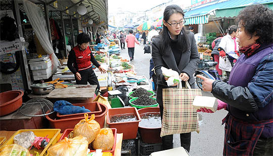 설명절을 5일 앞둔 9일 전주 남부시장을 찾는 손님이 늘어난 가운데 경제생활팀 이세명기자가 상인에게 제수용품 값을 흥정하며 설 체감물가를 알아보고 있다.