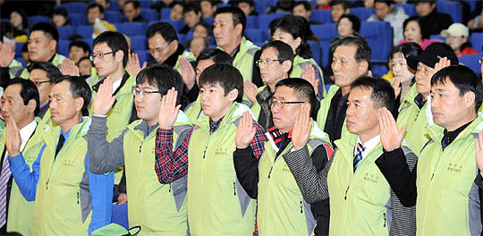 10일 전북도청 대강당에서 열린 새만금 환경지킴이 발대식이 지킴이들이 선서를 하고 있다.