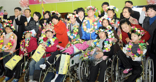 10일 전북재활학교 신관 강당에서 열린 '2009년 졸업증서 수여식'에서 재학생들과 학부모 등 400여명이 참석해 졸업기념 사진촬영을 하고 있다.