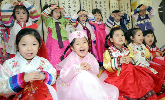 11일 전주 서신동 미래어린이집에서 원생들이 한복을 곱게 차려 입고 예절 교육을 하고 있다.