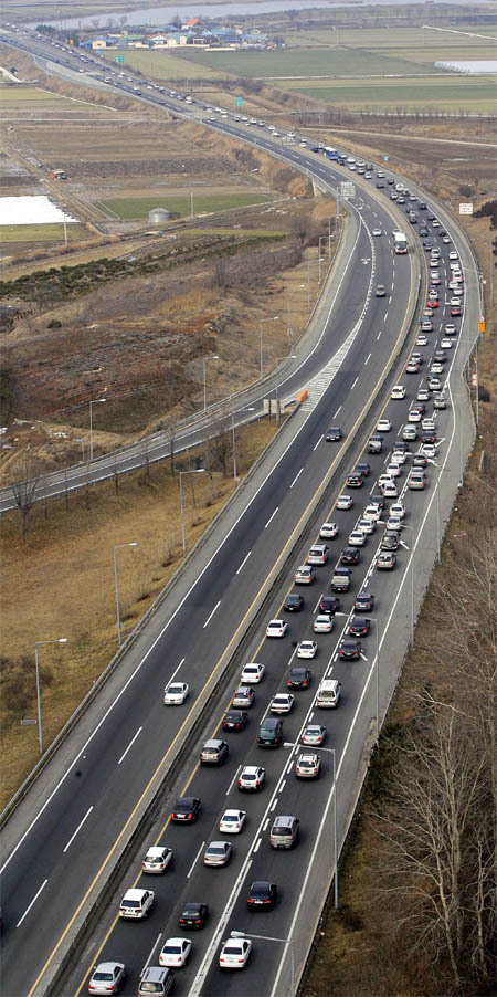 사흘간의 짧은 연휴를 보내고 다시 일터로 향하는 발걸음이 바쁘기만 하다. 설 연휴 마지막 날인 15일 오후 호남고속도로 전주 나들목에서 귀경 차량들이 길게 꼬리를 물고 있다.