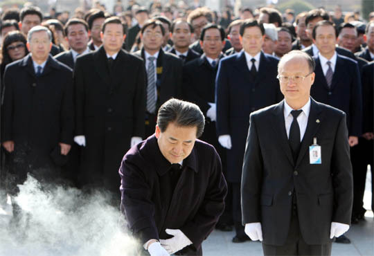 민주당 정동영 의원이 지지자들과 16일 오전 광주 북구 운정동 국립 5.18민주묘지를 방문해 분향을 하고 있다.