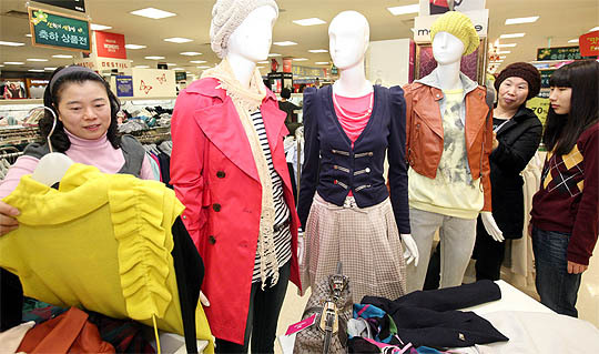 한낮의 기온이 영상 3도까지 올라간 16일 홈플러스전주점에서 고객들이 화사한 봄옷들을 고르고 있다.