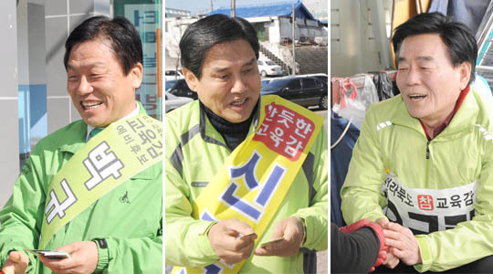 교육감 선거에 출마하는 예비후보들이 시민들을 만나며 자신의 지지를 호소하고 있다. 사진 왼쪽부터 박규선·신국중·오근량 예비후보.