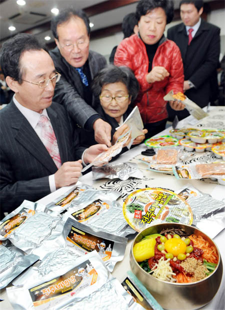 16일 전주시청에서 열린 전주비빔밥 우주식 인증서 전달식에서 송하진 시장과 관계자들이 우주식 비빔밥을 살펴보고 있다.