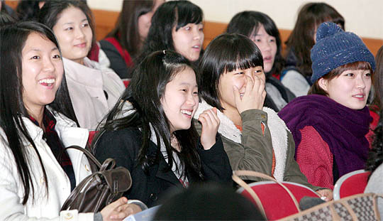 전북대학교 신입생오리엔테이션이 열린 17일 생활과학대 강당에 모인 학생들이 즐거운 대학생활을 기대하며 환하게 웃고 있다.